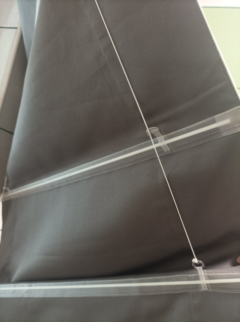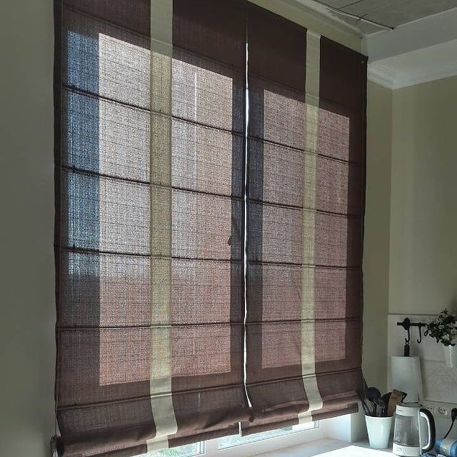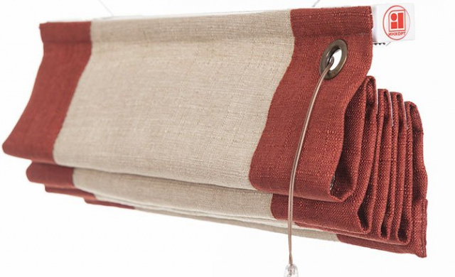 Современная римская штора представляет собой прямоугольное тканевое полотно. В которое на расстоянии около тридцати /двадцати сантиметров друг от друга вставлены горизонтальные фиберглассовые прутики.Сверху полотно на липучке крепится к карнизу.В сложенном состоянии римская штора выглядит как несколько слоев мягких складок. Которые собираются под карнизом. и занимают примерно столько места,сколько расстояние между волнами.